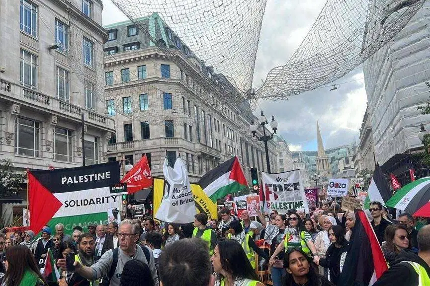 Lebih dari 200.000 orang berbaris di jalanan London pada Sabtu (14/10) untuk mengutuk kejahatan mengerikan oleh Israel terhadap Jalur Gaza. Protes ini diselenggarakan oleh Forum Palestina di Inggris (PFB), Kampanye Solidaritas Palestina (PSC), Sahabat Al-Aqsa (FOA), Asosiasi Muslim Inggris (MAB), dan Koalisi Hentikan Perang, dan Kampanye Solidaritas Palestina (PSC).