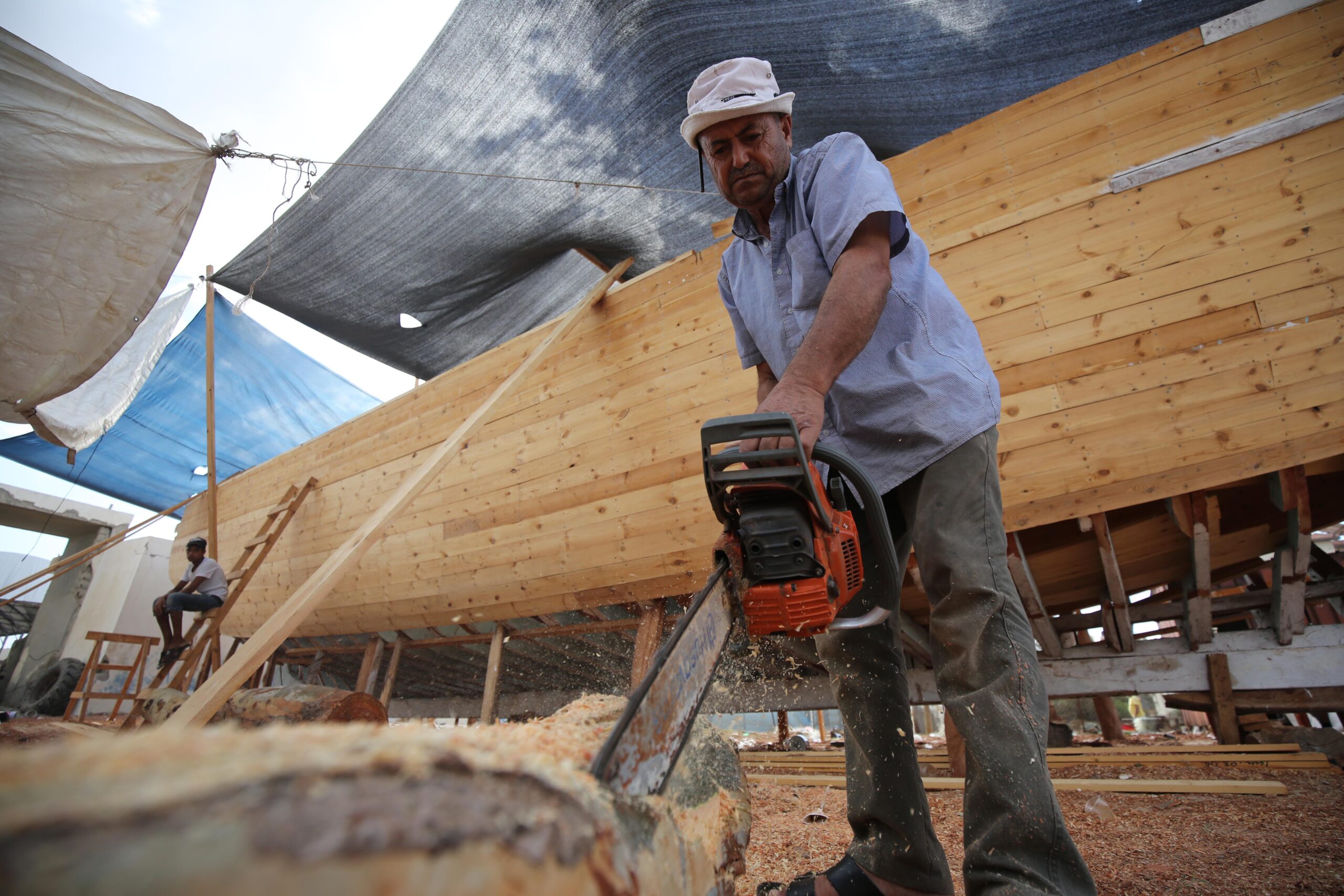 Tukang kayu Palestina di Jalur Gaza yang terkepung sedang membangun sebuah perahu nelayan besar, yang diharapkan akan memberikan penghasilan bagi sekitar 15 keluarga.