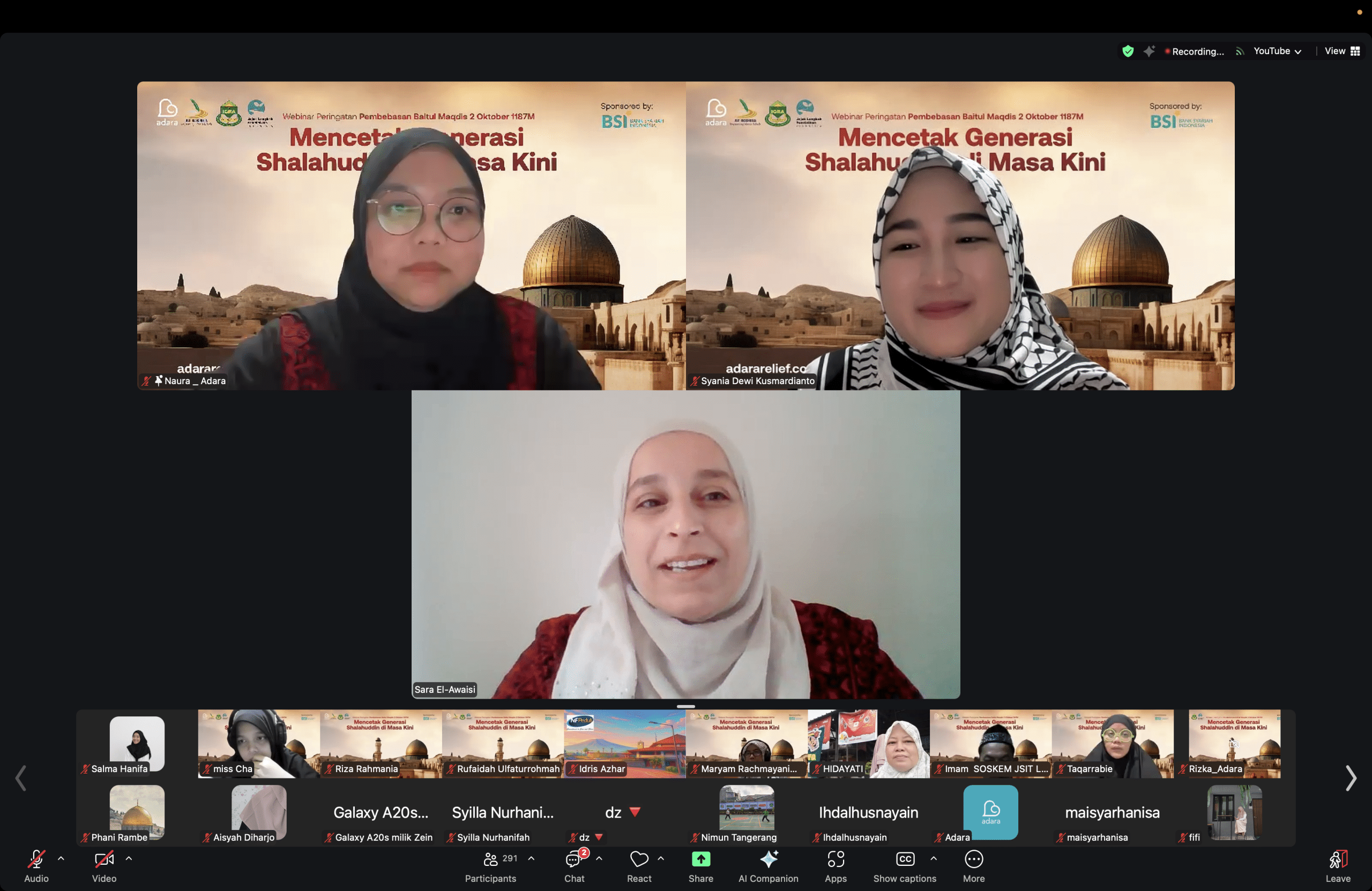 Sarah El-Awaisi mengisi webinar 838 Tahun Peringatan Pembebasan Baitul Maqdis dengan ditemani Naura Qisthi (penerjemah) dan Syania Dewi (MC) pada Ahad (5/10).